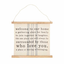 Our holiday rules reversible sign can last the entire holiday season. The grain sack hanger features mango wood weights. The sign hangs on a jute rope loop. The front of the sign reads "let us give thanks for the food before us, the family beside us, and the love between us." The reverse side reads "Christmas rules. Give Santa milk & cookies. Kiss under the mistletoe. Jingle all the way. Spread Christmas cheer. Enjoy each other. Eat, drink & be merry". Dimensions: 20" x 18 1/2" Material: CANVAS